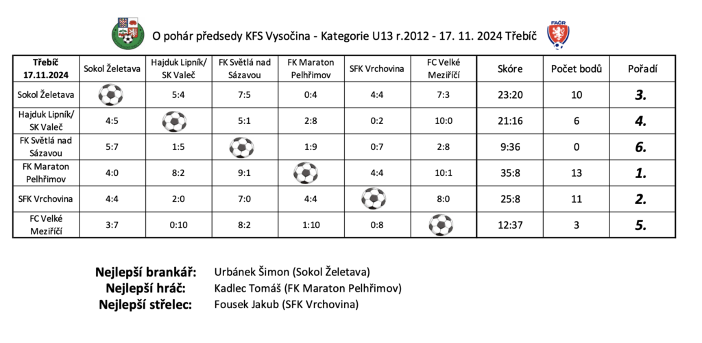 V neděli 17. 11. 2024 uspořádala KM KFS Vysočina tradiční turnaj O pohár předsedy KFS U13. Na prvním místě se umístil tým FK Maraton Pelhřimov, který za celý turnaj neokusil ani jednu porážku. Všem týmům děkujeme za účast a za předvedené výkony. 🍀⚽️